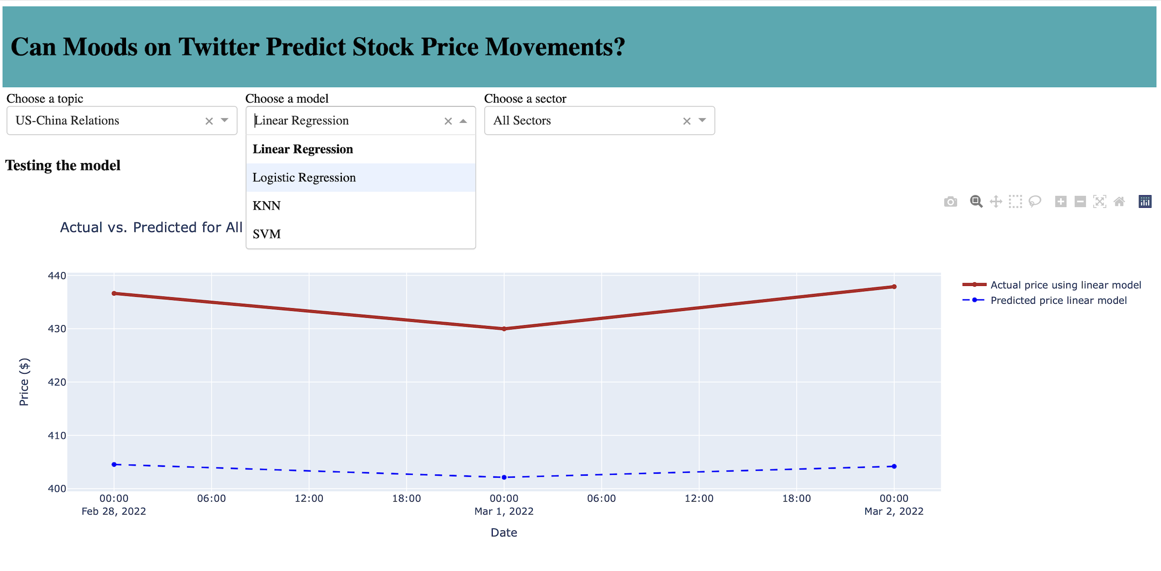 variety of topics. We used Python (pandas) to build basic models on how tweet polarity & sentiments are related to the daily movements of stock prices. Then coded with Python (Plotly Dash) to deploy an interactive dashboard for users to visualize the findings.