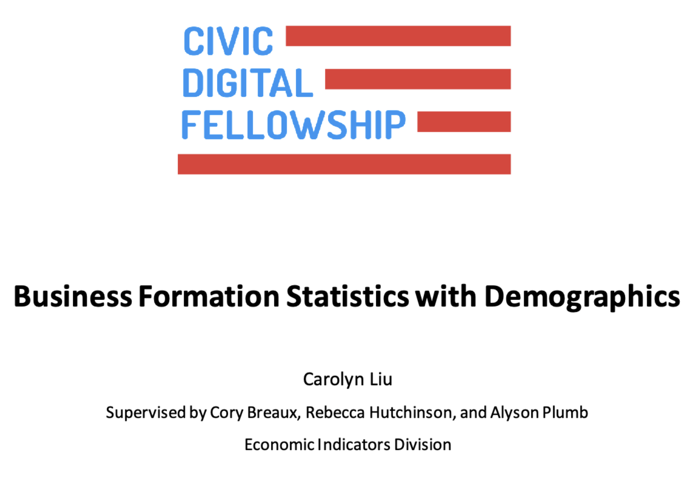 Project description: Civic Digital Fellow (summer 2022) at the U.S. Census Bureau’s Economic Indicators Division. The goal of the project was to enhance the usefulness of Business Formation Statistics (BFS), one of the Census Bureau’s newest data products that provides insight into early-stage business development.