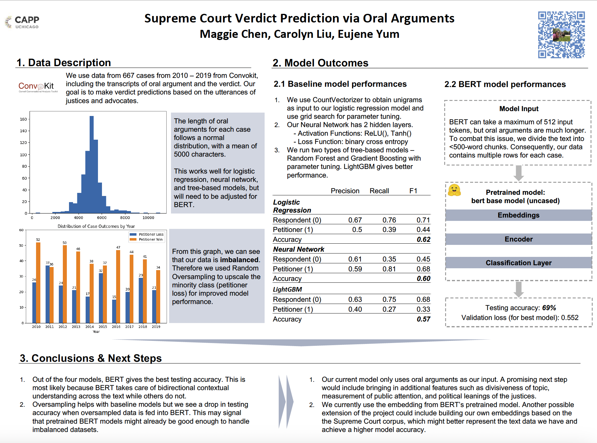 Project description: Final group project for Advanced Machine Learning for Public Policy (CAPP30255). As the highest court in the land, the Supreme Court hears cases that impact the country’s social, political and economic future. The outcomes of these decisions trickle down and impact our day to day lives as well. In this project, we aimed to predict the outcome of Supreme Court hearings solely using oral arguments of judges and advocates. We processed a total of 667 cases from 2010 - 2019. We fine-tuned and deployed a total of 4 models which include logistic regression, simple neural network, multiple tree-based models, and BERT. Through many iterations of model input and loss functions, we found that the BERT model provided us with the highest accuracy of 69%.